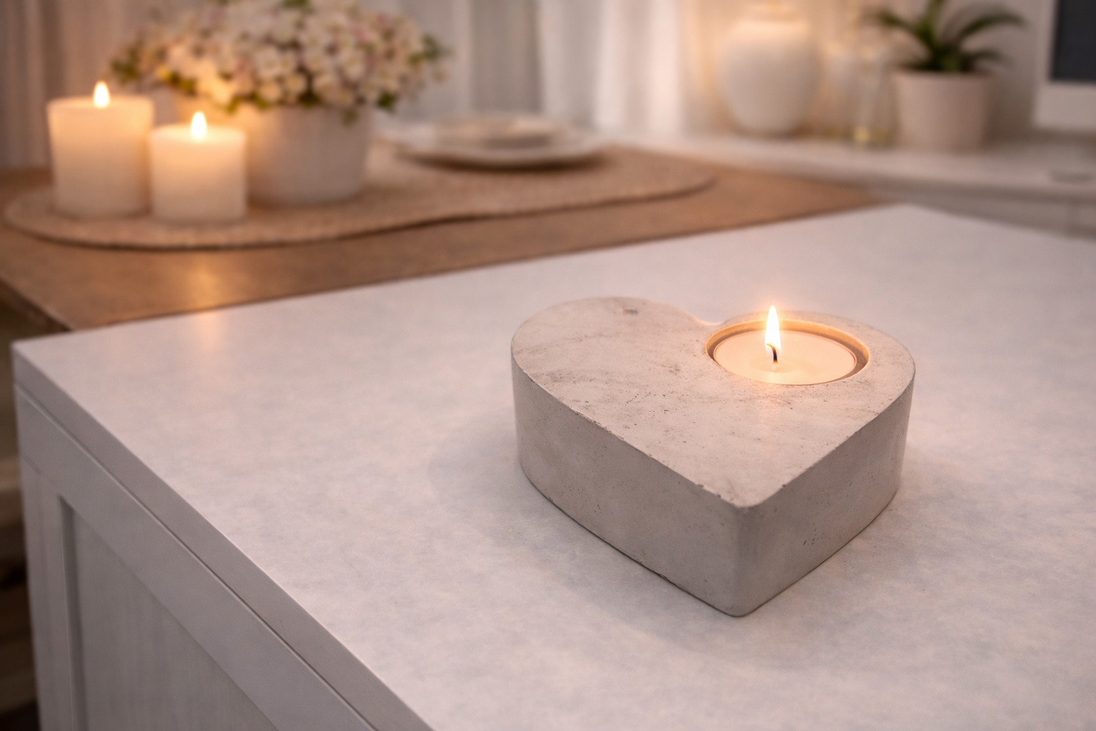 Teelicht in Herzform aus Gips gegossen. Dekorationen finden sie in dem Bereich Gestecke