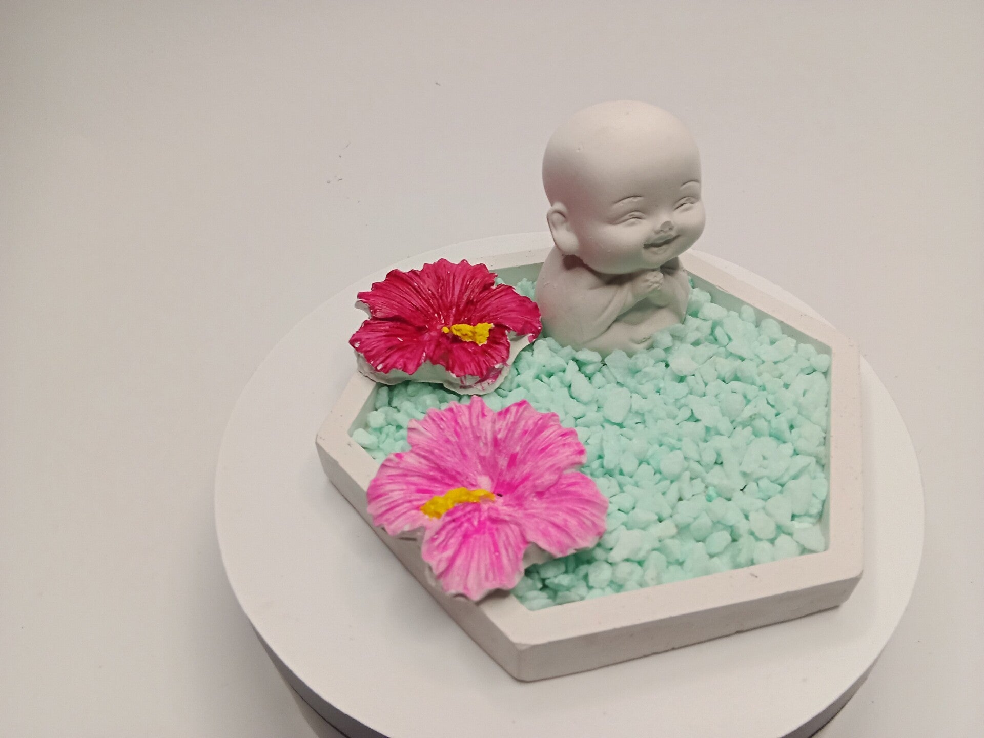 Platte aus Gips mit einem Buddababy mit Steinen und Blumen verziert