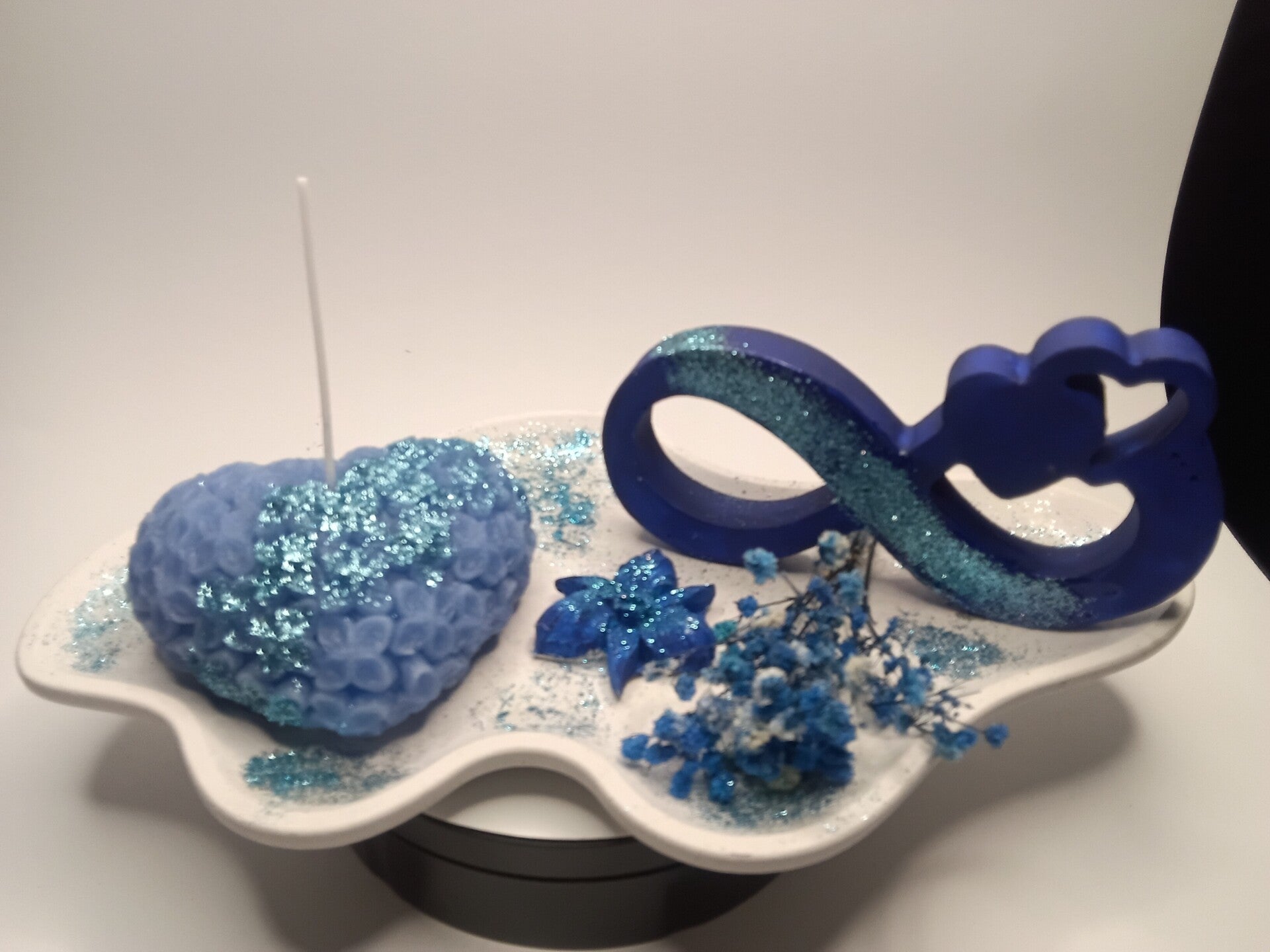 Gesteck mit eine Blumenherz Kerze ind aus Gips ein Unendlichkeitzzeichen